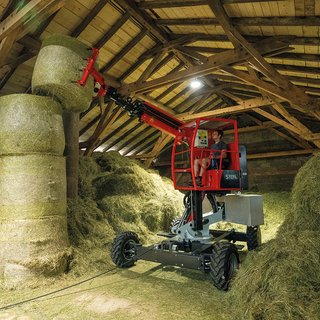 STEPA mobile cranes are flexible and versatile machines with a large number of everyday agricultural applications. These machines, often described as hay loaders or manure loaders, can be used both for jobs in the hay barn and for loading the muck spreader. They can also be used for smaller jobs involving wood when used with a log grab. The STEPA mobile crane is available in a 2- and 4-wheel version depending on the base frame and design. Depending on its location, it can be run using electricity, an additional pump or its own diesel engine.